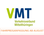 Pressemitteilung Preisänderungen im VMT Fahrpreise steigen im August um 9,97 Prozent Erfurt. Zum 1. August 2024 wird es im Verkehrsverbund Mittelthüringen (VMT) eine Tarifanpassung geben. Im Mittel steigen die Fahrpreise um 9,97 [...]
